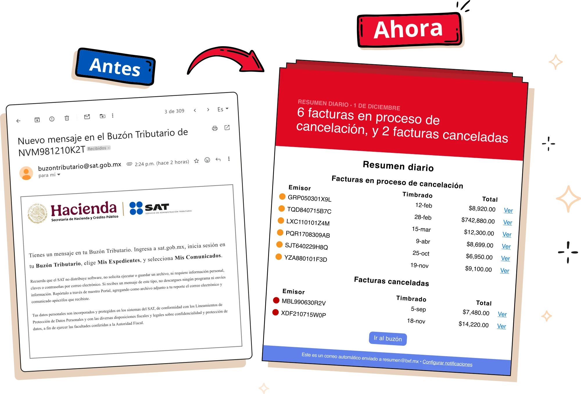 Las notificaciones llegan a todo el equipo automáticamente, ya no tenemos que estar reenviando correos del buzón tributario manualmente.